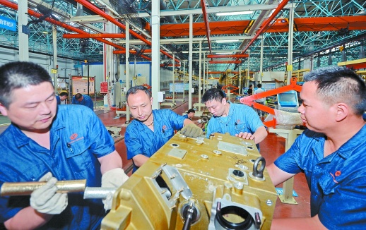 5月4日,中國兵器江麓機(jī)電集團(tuán)有限公司,工人在忙著裝配傳動(dòng)機(jī)械。近年,該公司依托產(chǎn)業(yè)優(yōu)勢搶占先機(jī),研發(fā)生產(chǎn)重型裝備與工程機(jī)械、傳動(dòng)機(jī)械系列產(chǎn)品,公司產(chǎn)品的市場占有額逐年攀升。(湖南日報(bào)記者 李健 通訊員 王慧崎 攝影報(bào)道)